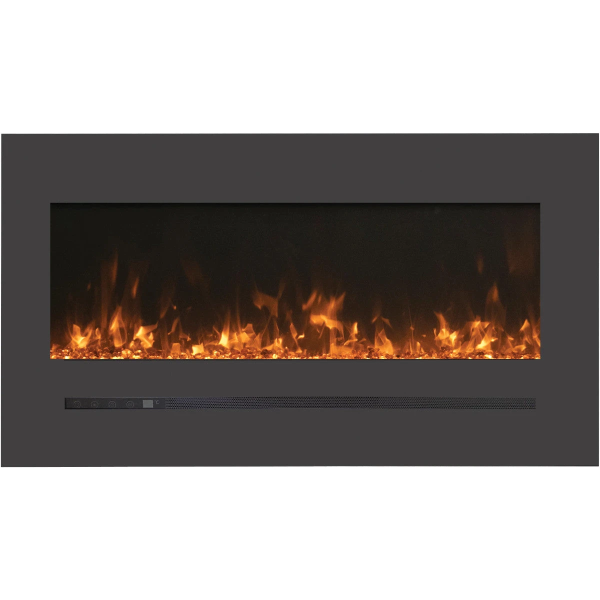 The WM-FML-STL 34″ the amantii wall mount electric fireplace series features a deep charcoal colored steel surround. The steel surround has aesthetic proportions and features a touchpad with a numerical temperature display.