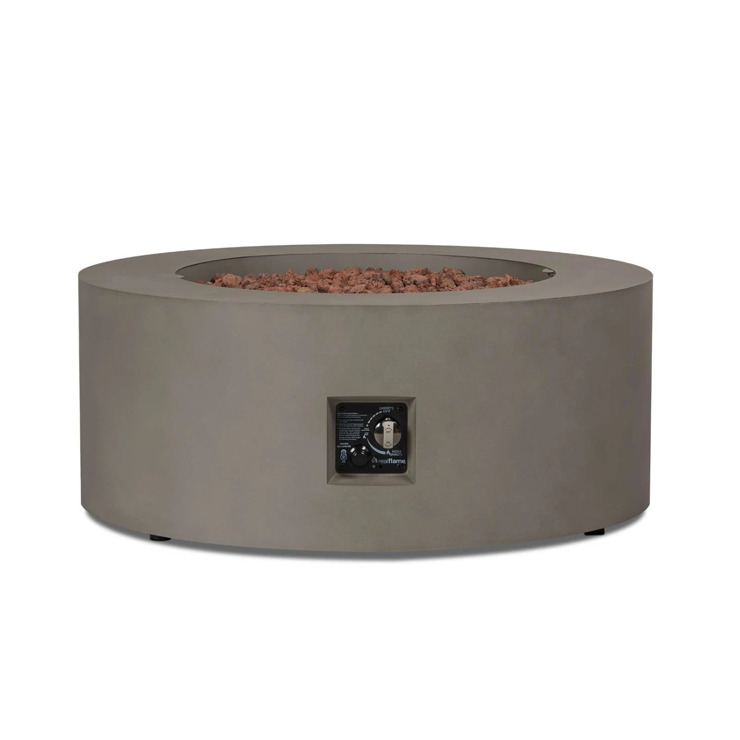 Make a stunning addition to your outdoor space with the clean, contemporary design of the Aegean round gas fire table. Made of durable steel with a lightly textured finish, this outdoor fire table features a reliable push-summary ignition and has adjustable flame height. Gas fire pit table with leveling feet, stainless steel burner, burner lid, lava rock, storage cover, propane hose with regulator and natural gas conversion kit are included. Providing 50,000 BTUs of heat, this outdoor propane fire pit can be converted to natural gas by a certified natural gas technician using the conversion kit. When not in use, transform this gas fireplace into a useful outdoor coffee table with the matching burner lid. Complete your patio set with the Aegean outdoor chair, loveseat, sofa and propane tank cover that doubles as a side table. Real Flame® gas fire pits are CSA certified and weather, sun and rust resistant.
