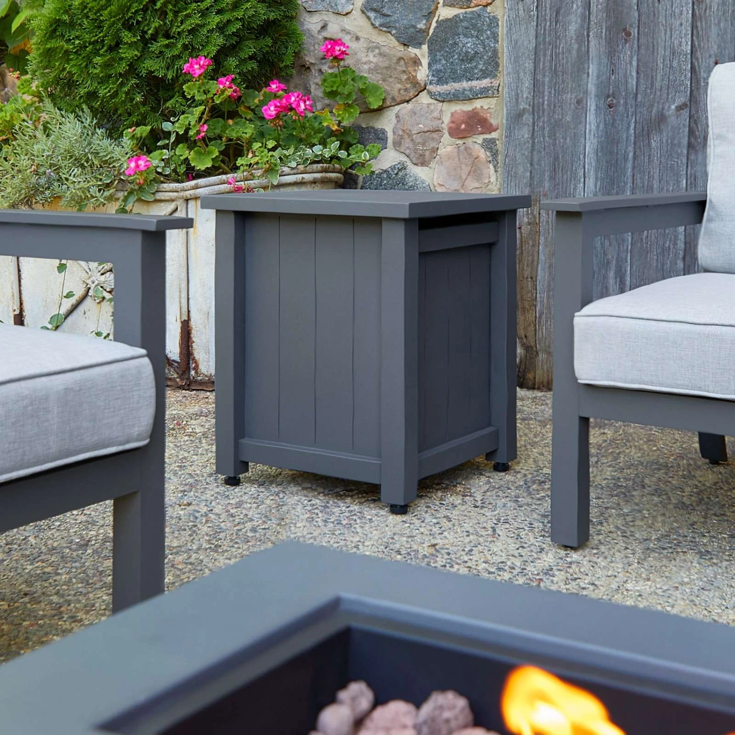 Coordinating with the Ortun fire pit table, this modern propane tank cover conceals a 20 lb propane tank and doubles as a stylish side table. This steel tank cover comes fully assembled and can be used when the fire table is in use. Real Flame® outdoor propane tank covers are weather, sun and rust resistant. At Real Flame Company, we are committed to providing beautifully designed, safe, high-quality indoor electric fireplaces, outdoor fire pits and accessories, and outdoor furniture.